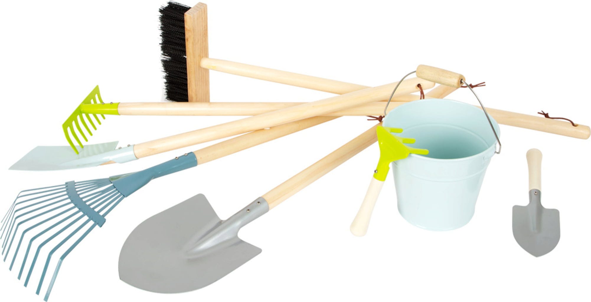 Contenuto: 2 rastrelli, pala, vanga, scopa, secchio di metallo e due piccoli attrezzi da giardino