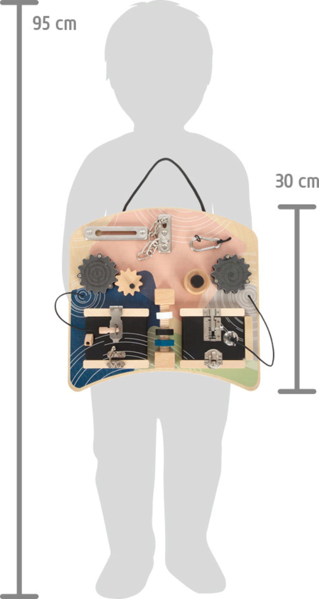 C'è molto da scoprire con questa tavola per le attività motorie. Diverse serrature, due ruote dentate, un'asta filettata con dadi e altre cose da scoprire aspettano i bambini curiosi, che contemporaneamente allenano giocosamente la destrezza e la coordinazione occhio-mano.