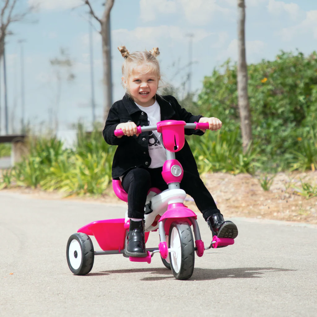 Sei alla ricerca di un triciclo che accompagni il tuo bambino dalle prime uscite fino ai primi tentativi autonomi di pedalata? Lo smarTrike Breeze Plus è la scelta ideale per famiglie attive. Come versatile stroller-trike, si adatta in quattro fasi alla crescita del tuo bambino a partire da circa 15 mesi. Grazie alla tecnologia brevettata Touch Steering, puoi guidare il triciclo con la stessa facilità di un passeggino, mentre il bambino resta seduto in sicurezza.
