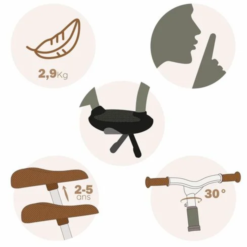 La bicicletta è particolarmente leggera e resistente e permette una guida sicura. L'angolo di sterzata è limitato a 30° e le ruote sono silenziose. Inoltre la sella è regolabile in altezza e consente quindi di utilizzare il veicolo più a lungo. I più piccoli possono appoggiare i piedini sulla pedana centrale.