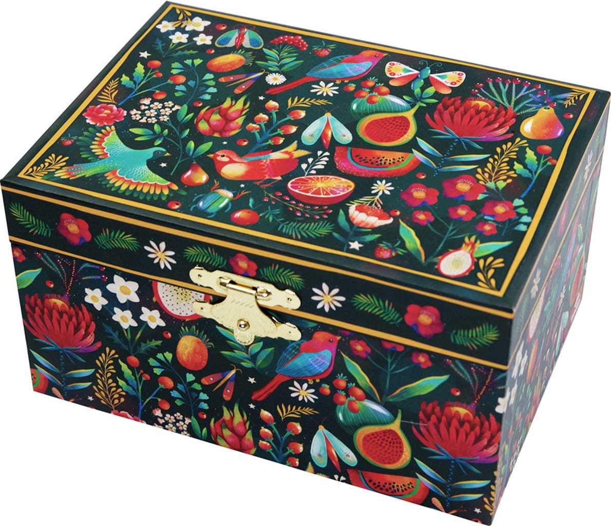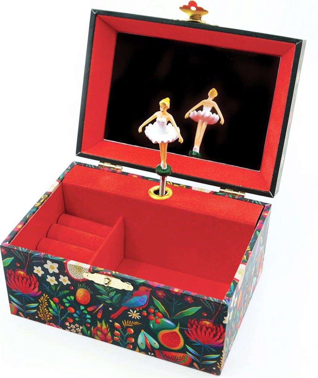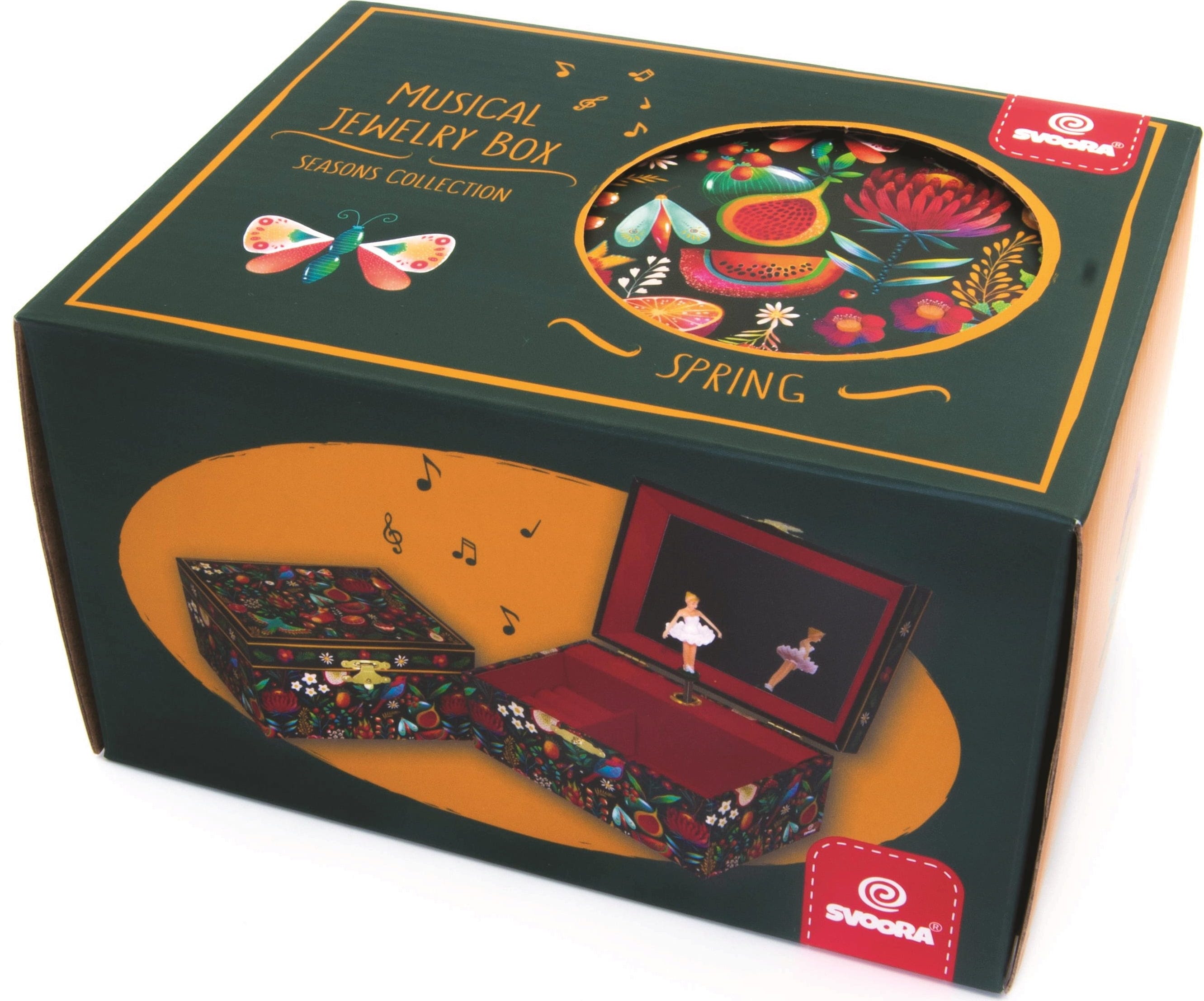 Questo adorabile portagioie musicale ha molto spazio per tesori preziosi. Basta tirare e aprire. Con i primi suoni della Danza della Fata Confetto dal balletto di fama mondiale Lo Schiaccianoci di Ciajkovskij, la graziosa ballerina inizia a girare. Il carillon include uno specchio e un porta anelli.