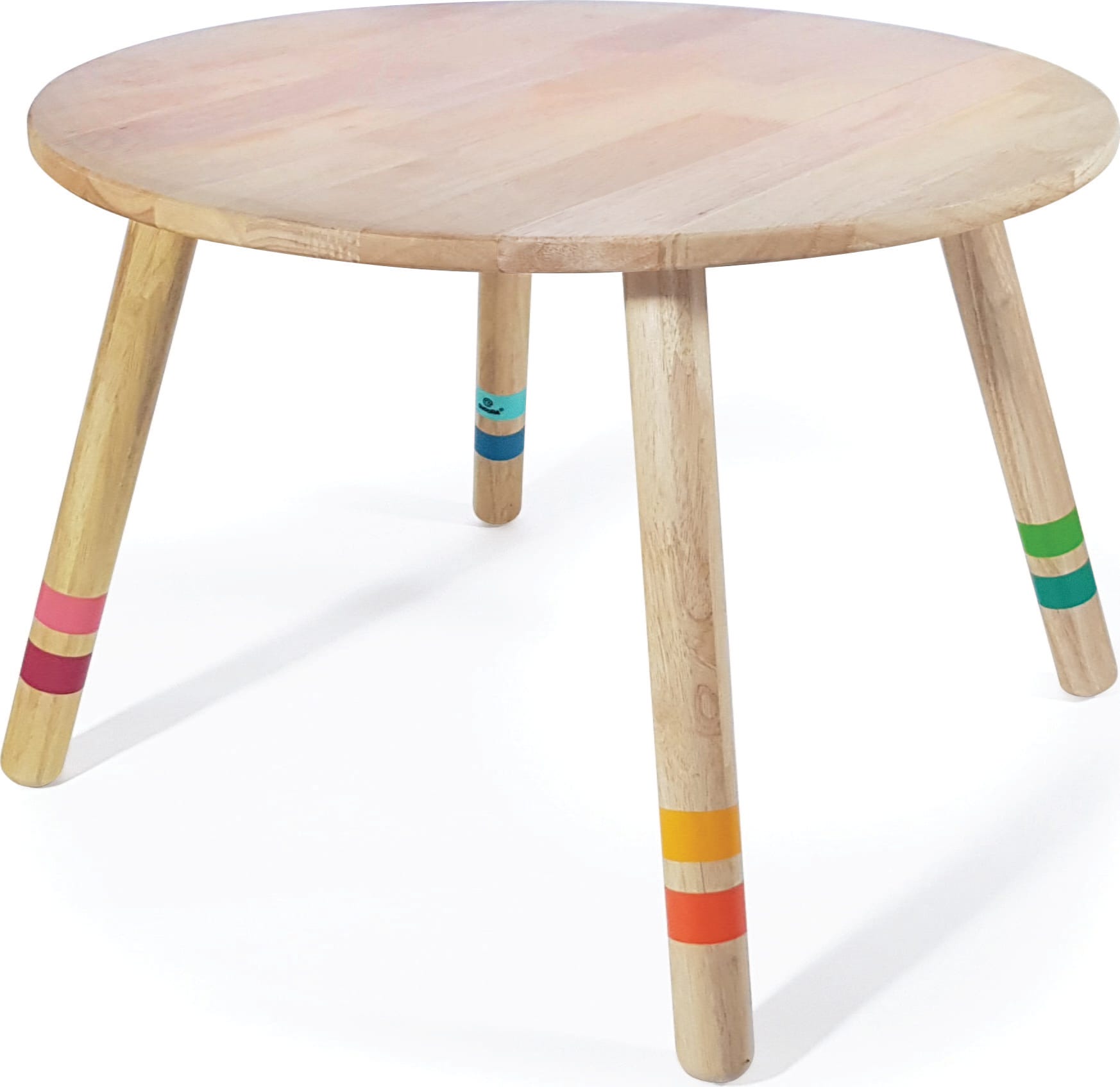 Questo tavolo rotondo stabile in legno massello di Ficus Elastica (albero del caucciù) è perfetto per la cameretta dei bambini. Il design naturale si armonizza con qualsiasi interno. Il montaggio delle gambe è molto semplice e le linee colorate danno quel tocco in più.