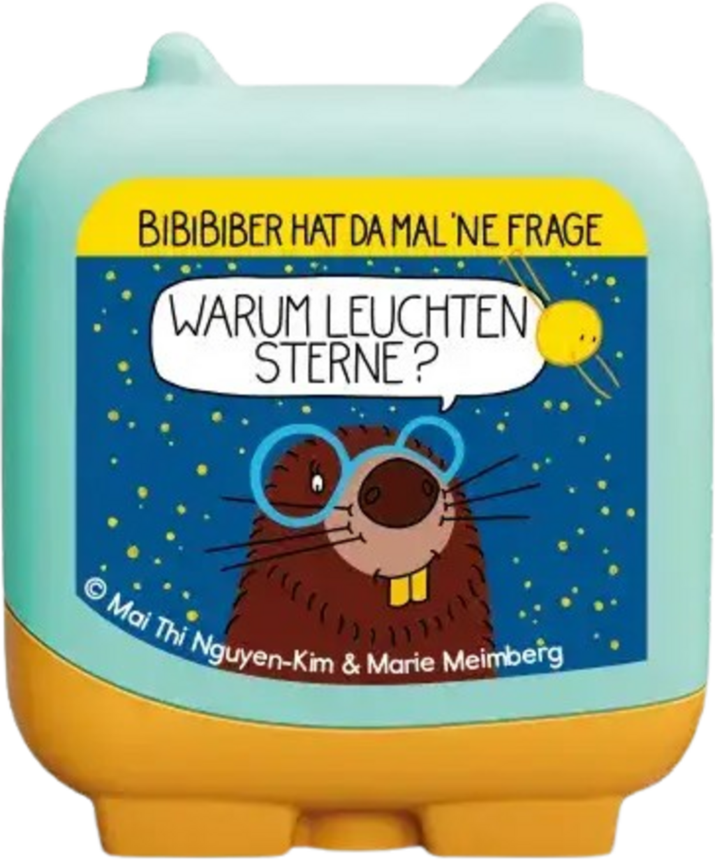 Con questa figura audio della serie Clever Tonies accompagni BiBiBiber in un affascinante viaggio alle origini dell’universo. La chimica Mai Thi Nguyen-Kim e l’artista Marie Meimberg uniscono conoscenza, poesia e musica per spiegare in modo chiaro e coinvolgente perché le stelle brillano, dai minuscoli movimenti delle particelle al ciclo del carbonio che dà vita a tutto ciò che ci circonda.