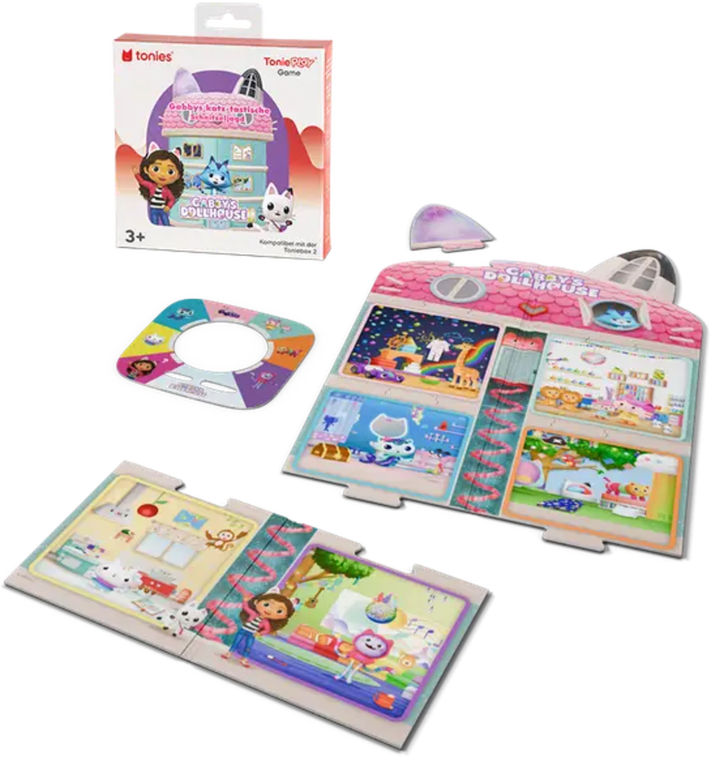 Con questo gioco interattivo Tonieplay, i bambini entrano direttamente nel mondo coloratissimo di Gabby's Dollhouse. L'avventura unisce il piacere dell'ascolto a un originale puzzle-gioco da tavolo che si trasforma nella cameretta nella versione dettagliata della casa delle bambole di Gabby. Durante una coinvolgente caccia al tesoro, i giocatori esplorano una stanza dopo l'altra alla ricerca di oggetti nascosti.