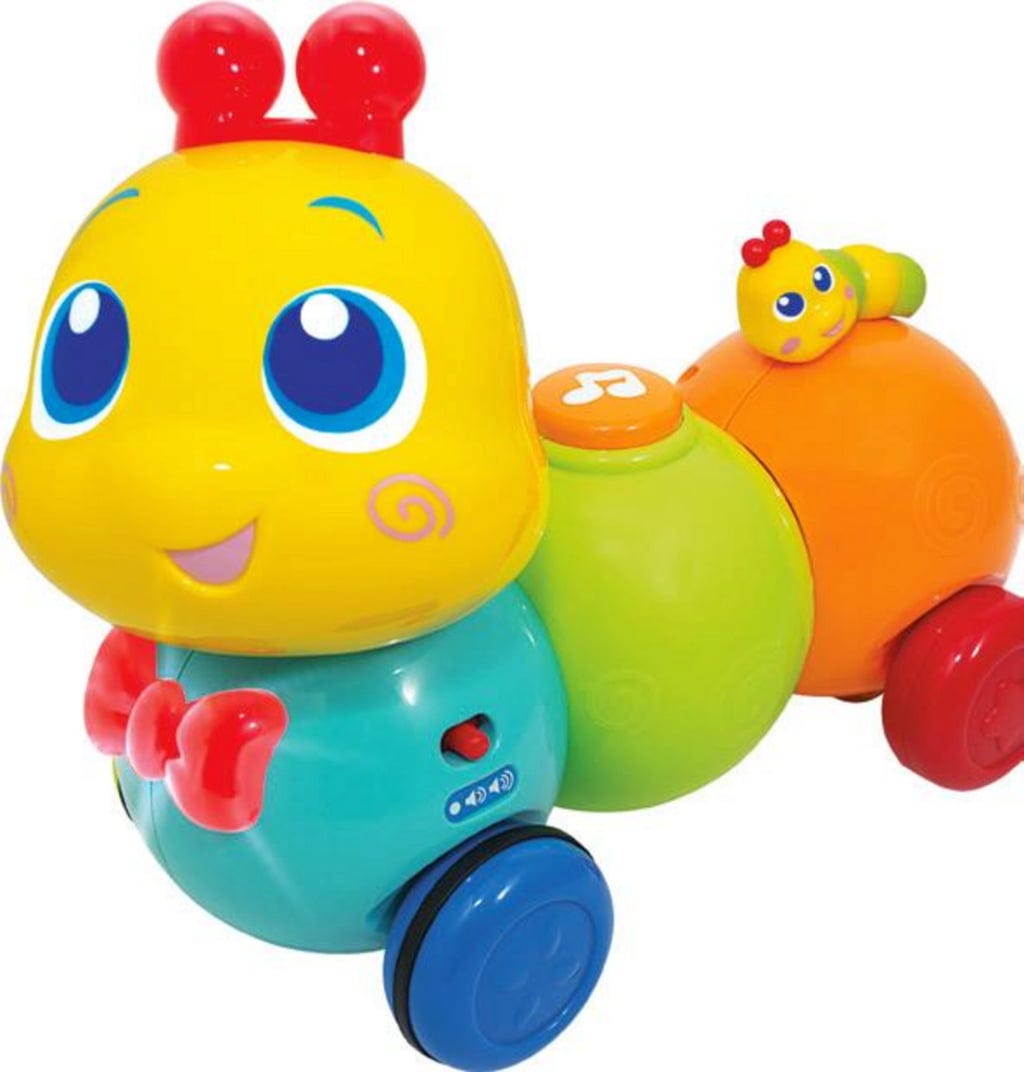 Che bruco simpatico! Se azionato con il telecomando incluso, cammina attraverso la stanza e riproduce melodie divertenti. Premendo i pulsanti, si allena la coordinazione occhio-mano in modo particolarmente giocoso.