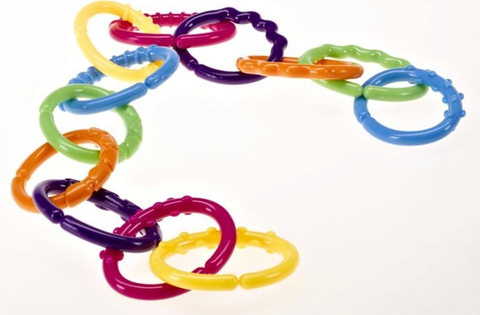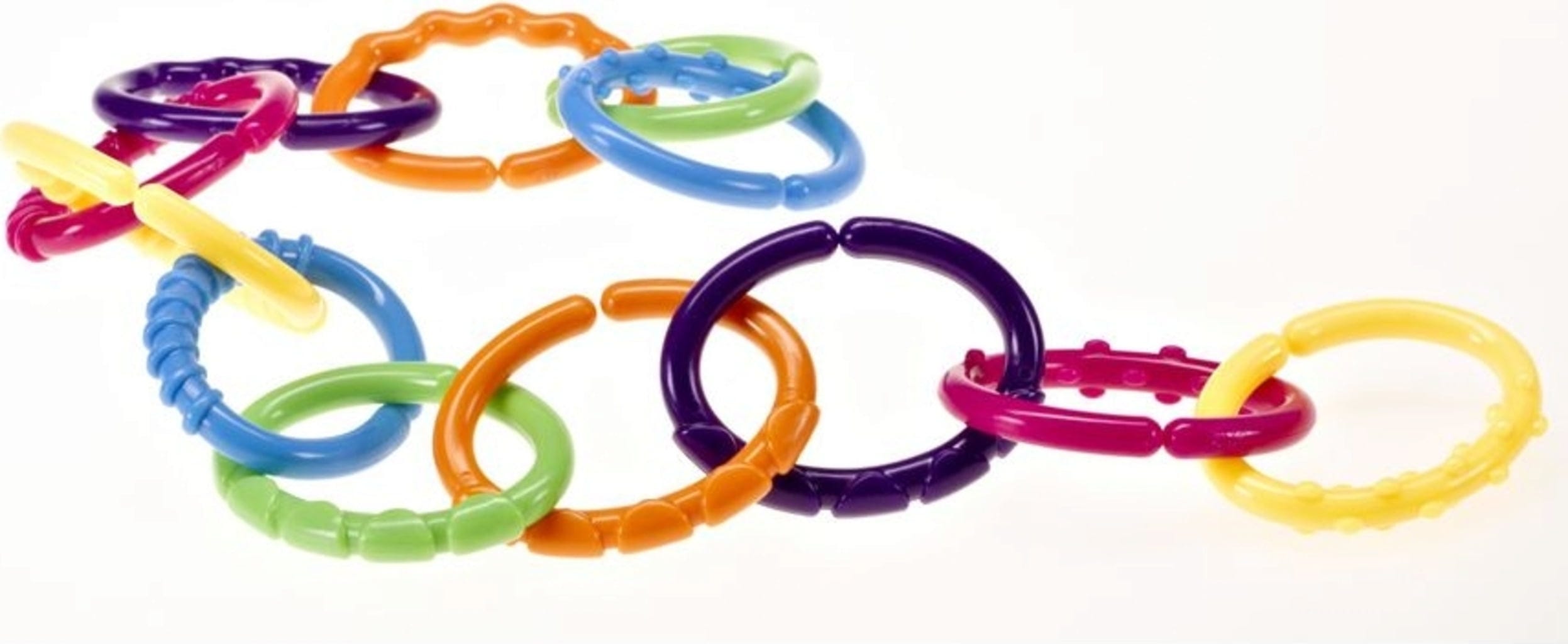 C'è molto da scoprire con questa catena a sonagli! La prima cosa che colpisce sono i colori, poi le superfici diverse e i rumori. Gli anelli si possono mettere in bocca, tirare o spingere, e permettono di allenare le capacità motorie dei bambini. Si fissano facilmente a carrozzine o marsupi e ci si può anche appendere i giocattoli, che così non si perderanno per strada.