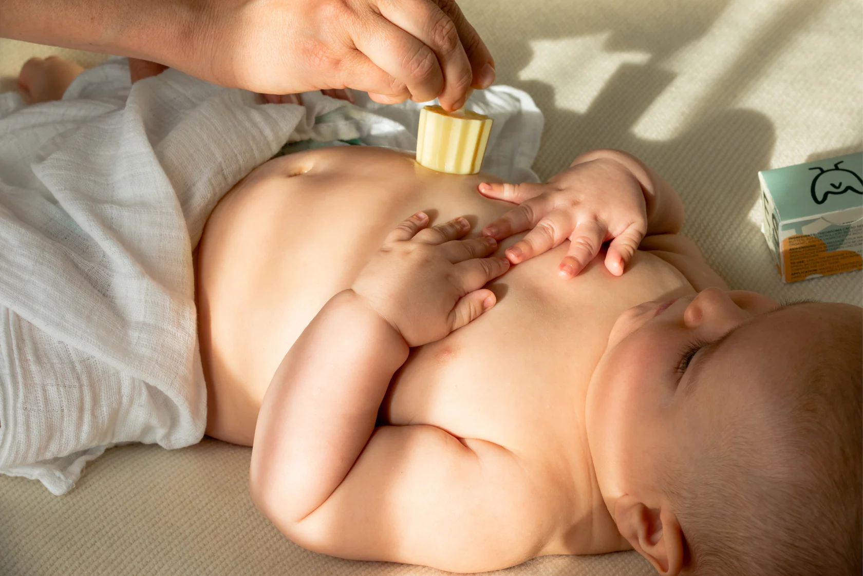 Il supporto in cera di carnauba vegana permette di massaggiare comodamente il bambino senza ungere le mani.