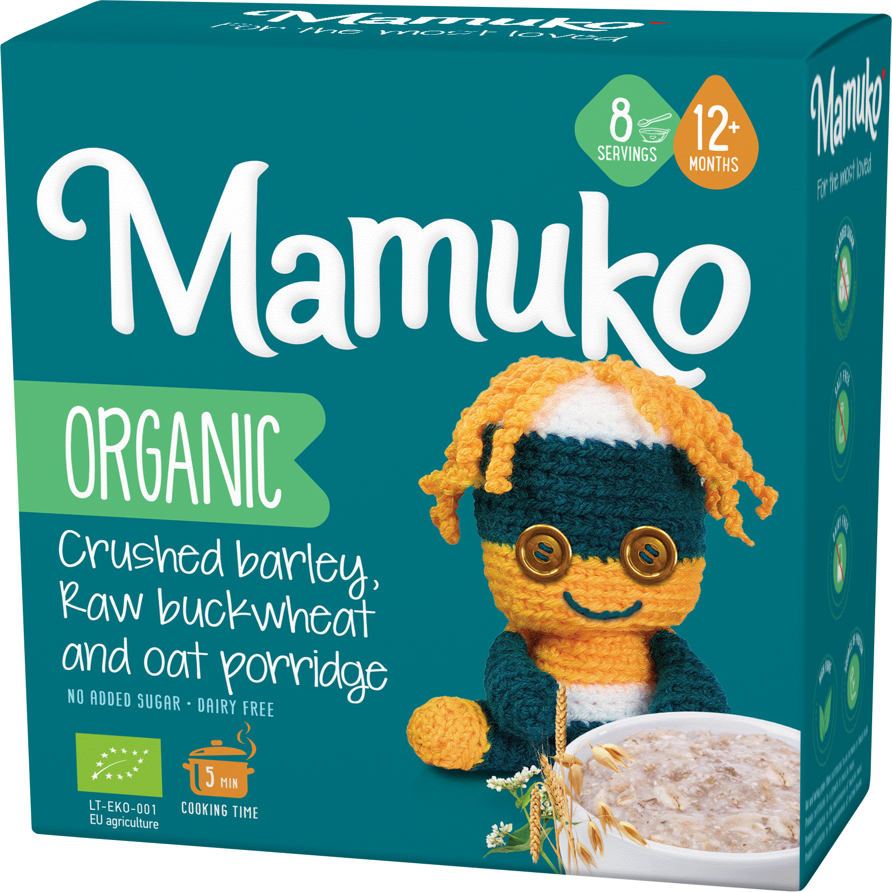 Mamuko Bio-Brei mit rohem Buchweizen, zerstoßener Gerste und Haferflocken - für Babys ab 12 Monaten.