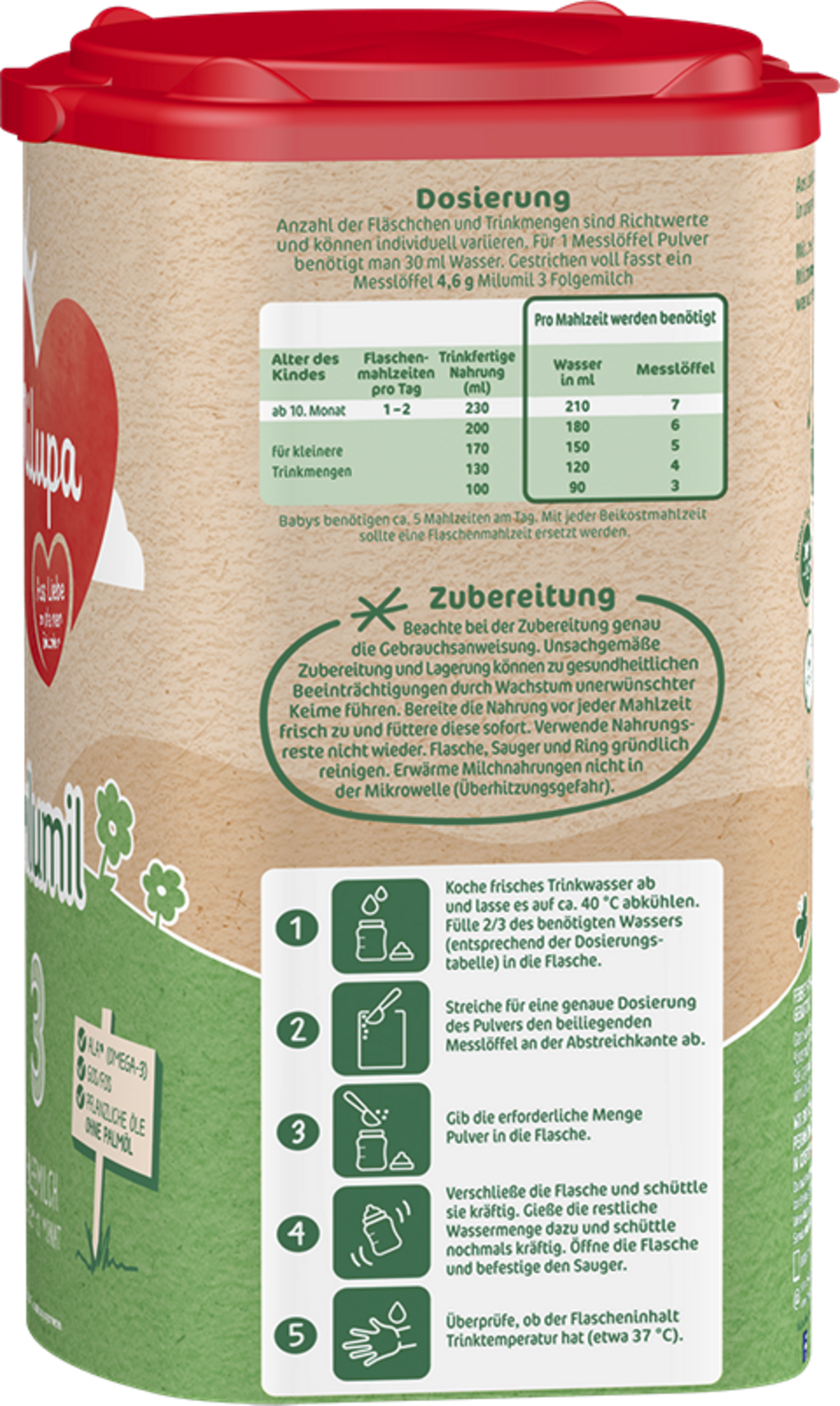 Die Milumil 3 Folgemilch ist als Milchmahlzeit ab dem 10. Lebensmonat bis zum Ende des Flaschenalters geeignet. Die Rezeptur, eine spezielle Ballaststoffmischung aus Galacto- und Fructooligosacchariden sowie der Vitamin- und Nährstoffgehalt sind altersgerecht abgestimmt.