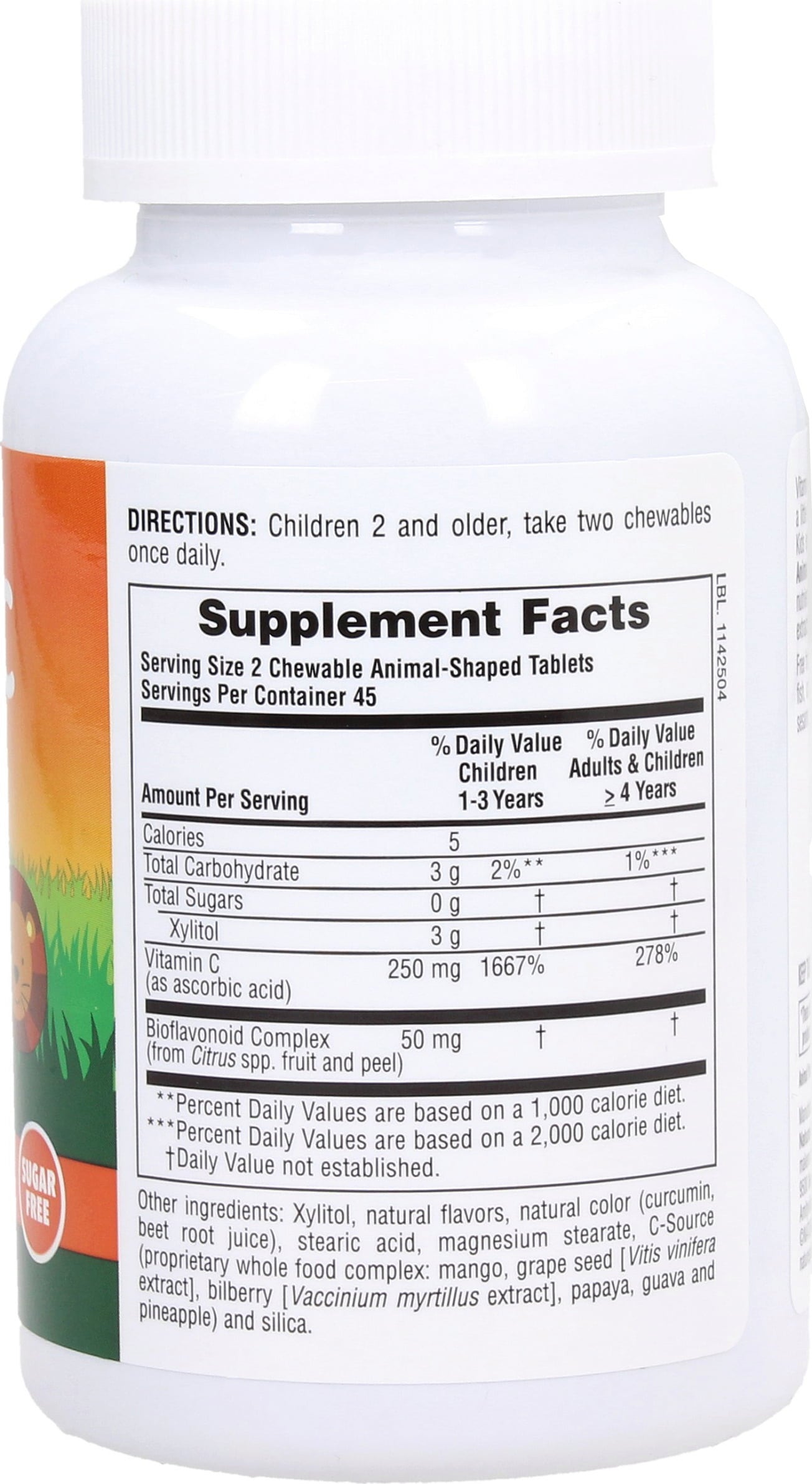 Eine Kautablette liefert 125 mg Vitamin C zusammen mit 25 mg Zitrus-Bioflavonoiden, Extrakten aus Traubenkernen und Heidelbeeren sowie Konzentraten aus Mango und Papaya. Die Kautabletten in den lustigen Tierformen schmecken nach Orange und sind für Kinder ab 2 Jahren geeignet.