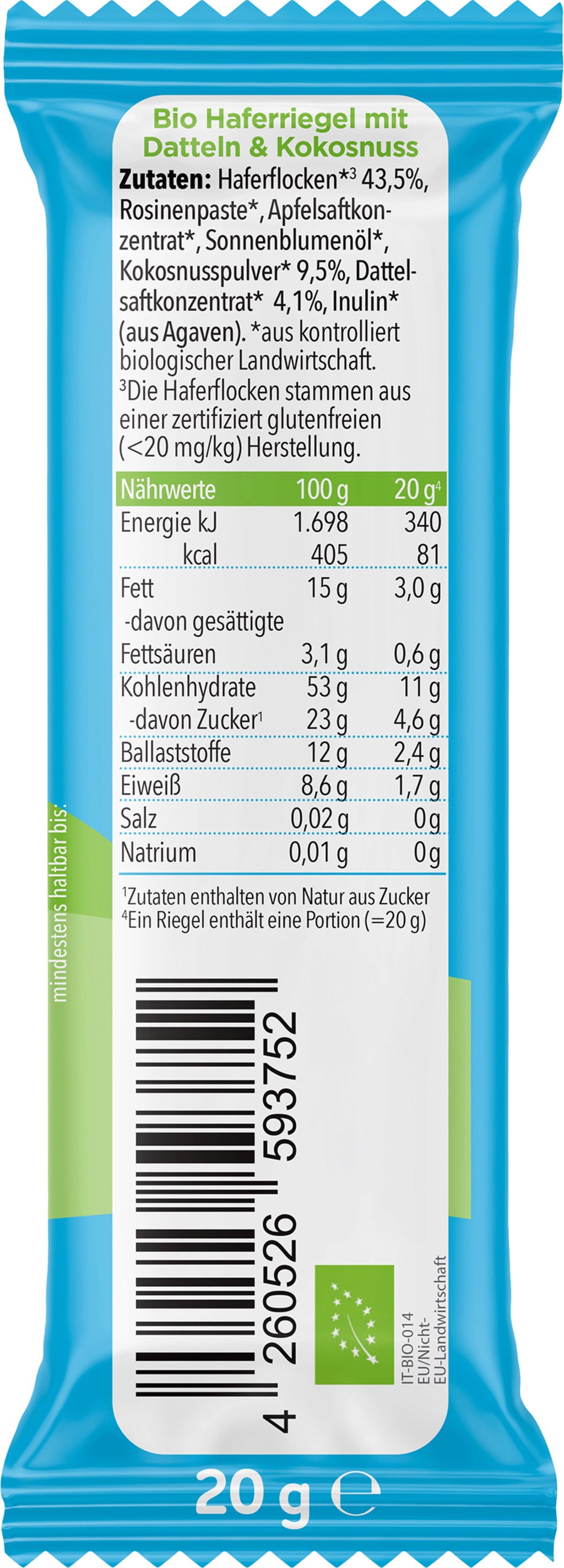 43,5 % Haferflocken[1], Rosinenpaste[1], Apfelsaftkonzentrat[1], Sonnenblumenöl[1], 9,5 % Kokosnusspulver[1], 4,1 % Dattelsaftkonzentrat[1], Inulin aus Agaven[1]