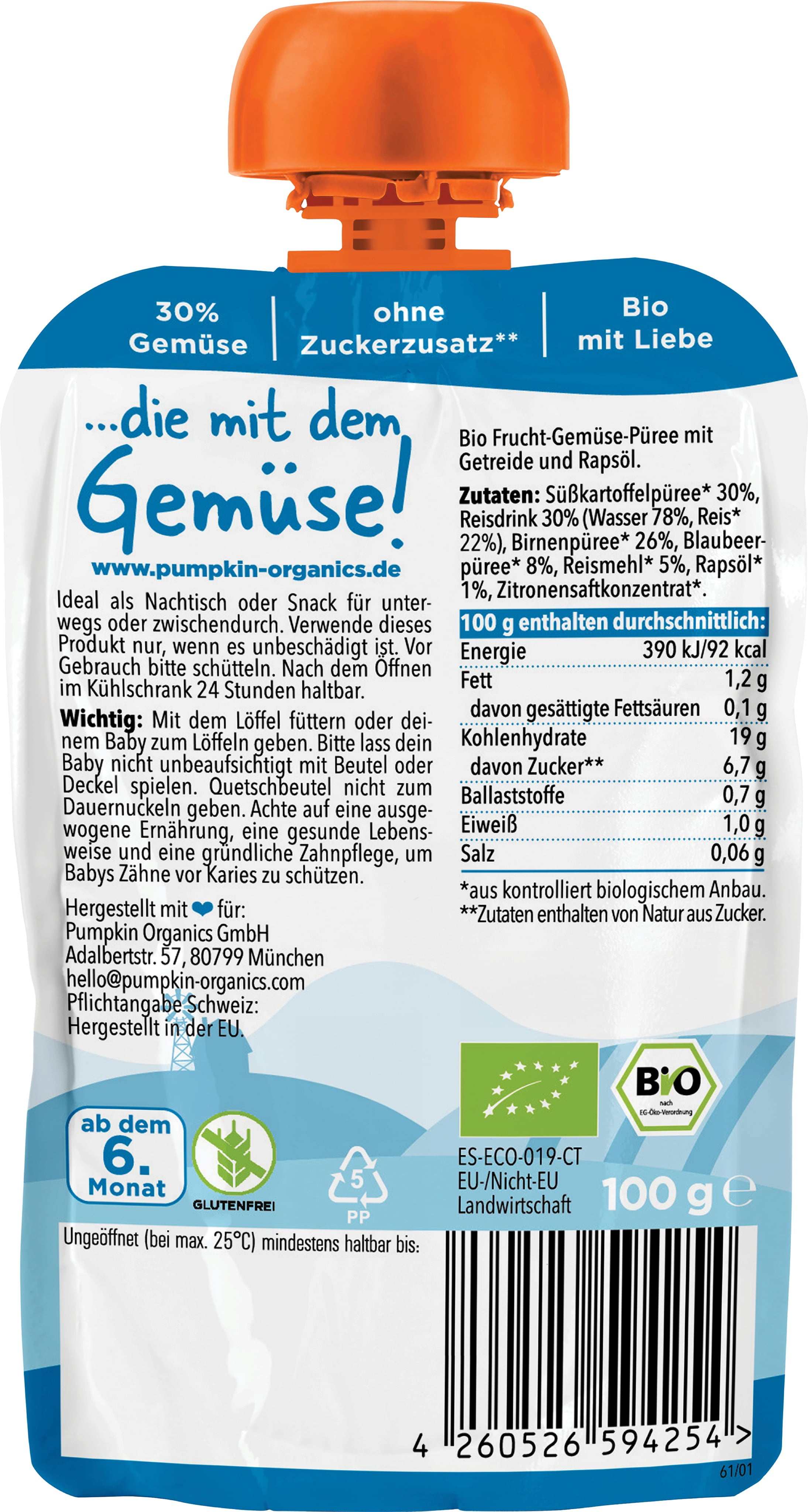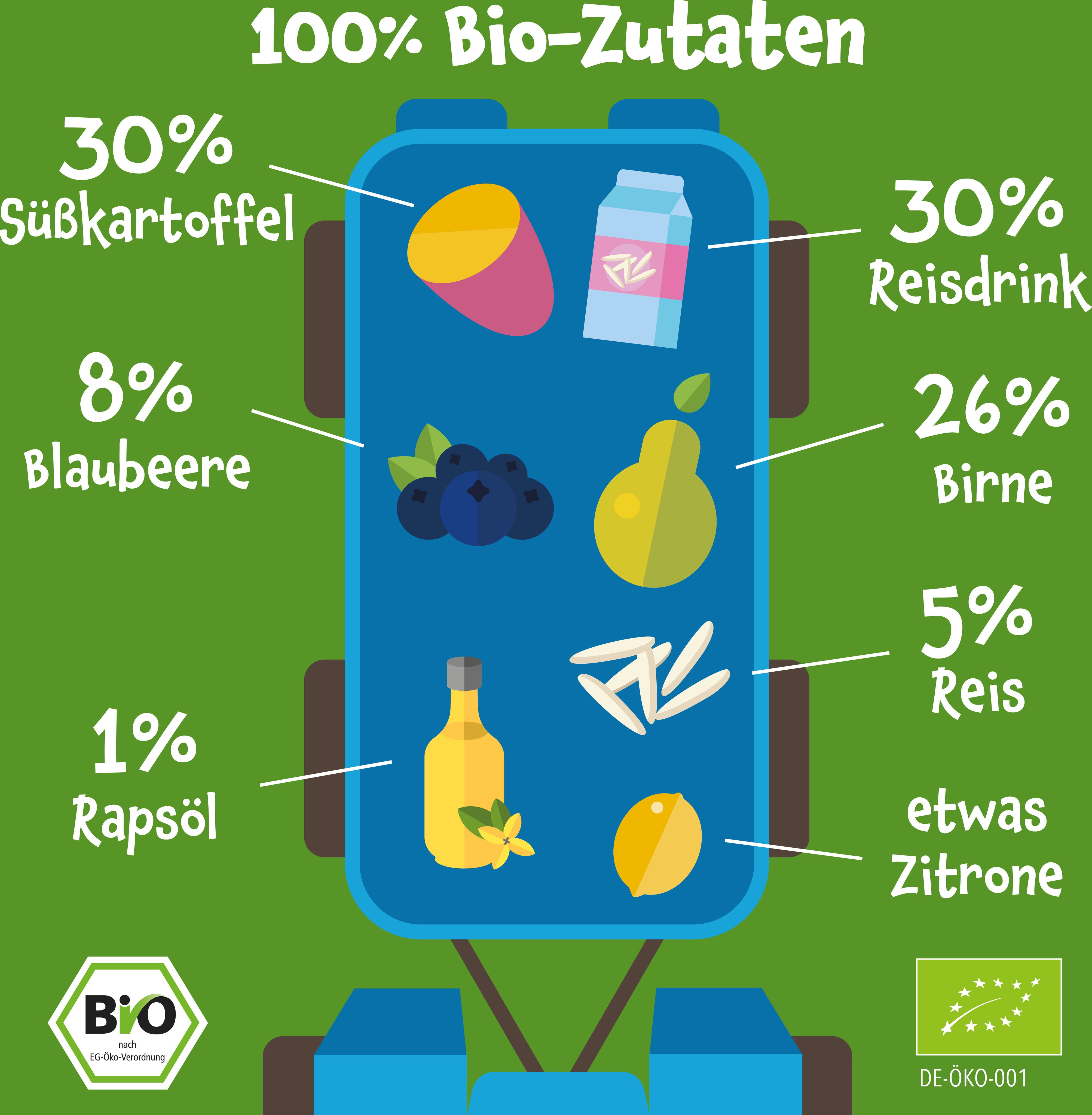 30 % Süßkartoffelpüree, 30 % Reisdrink (78 % Trinkwasser, 22 % Reis), 26 % Birnenpüree, 8 % Blaubeerpüree, 5 % Reismehl, 1 % Rapsöl, Zitronensaftkonzentrat