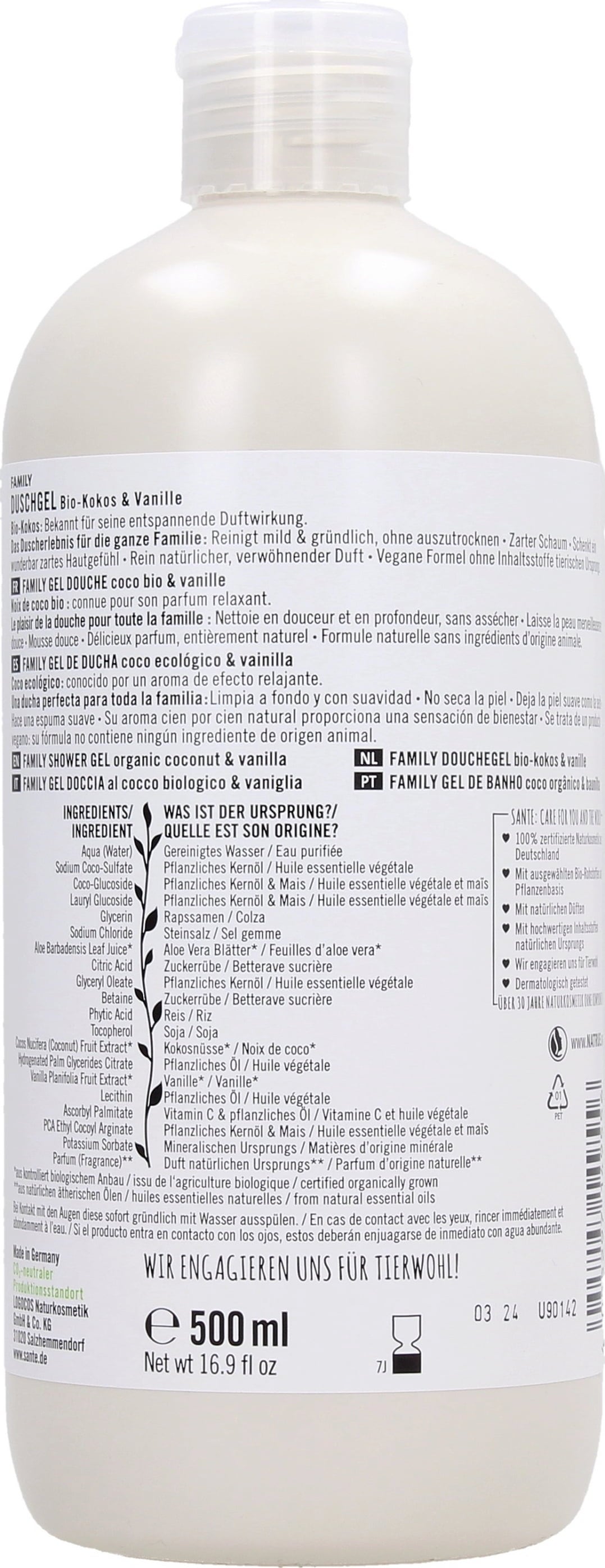 SANTE Naturkosmetik Family Duschgel Bio-Kokos & Vanille, 500 ml