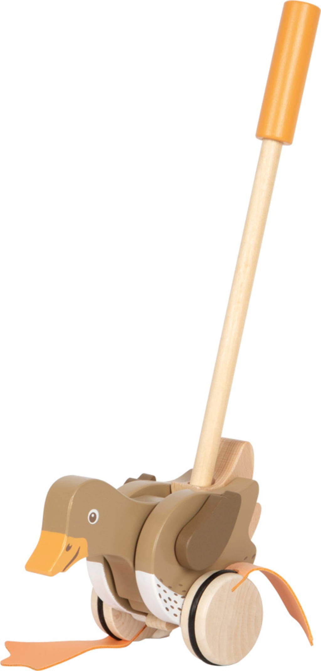 Diese liebevoll gestaltete Schiebe-Ente aus FSC® 100%-zertifiziertem Holz ist der perfekte Begleiter für die ersten Schritte. Beim Schieben watschelt sie fröhlich drauflos, bewegt dabei Kopf und Flügel und sorgt mit ihren lustigen Geräuschen für Begeisterung bei kleinen Laufanfängern. Die gummierten Räder schonen empfindliche Böden und ermöglichen ein leises Vorwärtskommen, während der gut greifbare Schiebestab – der sich für den Transport teilen lässt – optimal in Kinderhände passt.