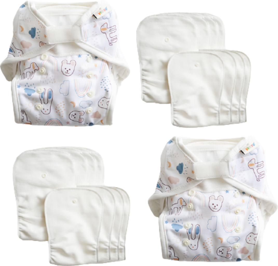 Die Starter Box von Vimse enthält Stoffwindeln im neuen, innovativen Design. Durch die weichen Klettverschlüsse und die Einstellknöpfe passen sich die Windeln perfekt an den Körper deines Babys an und wachsen sozusagen mit. Die One Size Windeln bestehen aus einem zweiteiligem System (All-in-Two): einer wasserdichten Windelüberhose und den zwei wechselbaren Einlagen. Bei einem Gewicht von unter 8 kg ist die kleinere Einlage ausreichend, ansonsten werden die große und die kleine miteinander kombiniert.
